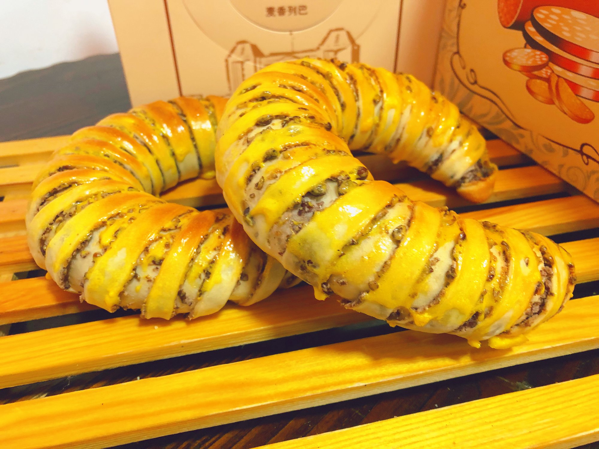 整體呈字母“C”狀,有環(huán)形切口,添加了甜甜的豆沙。金黃色,松軟香甜。