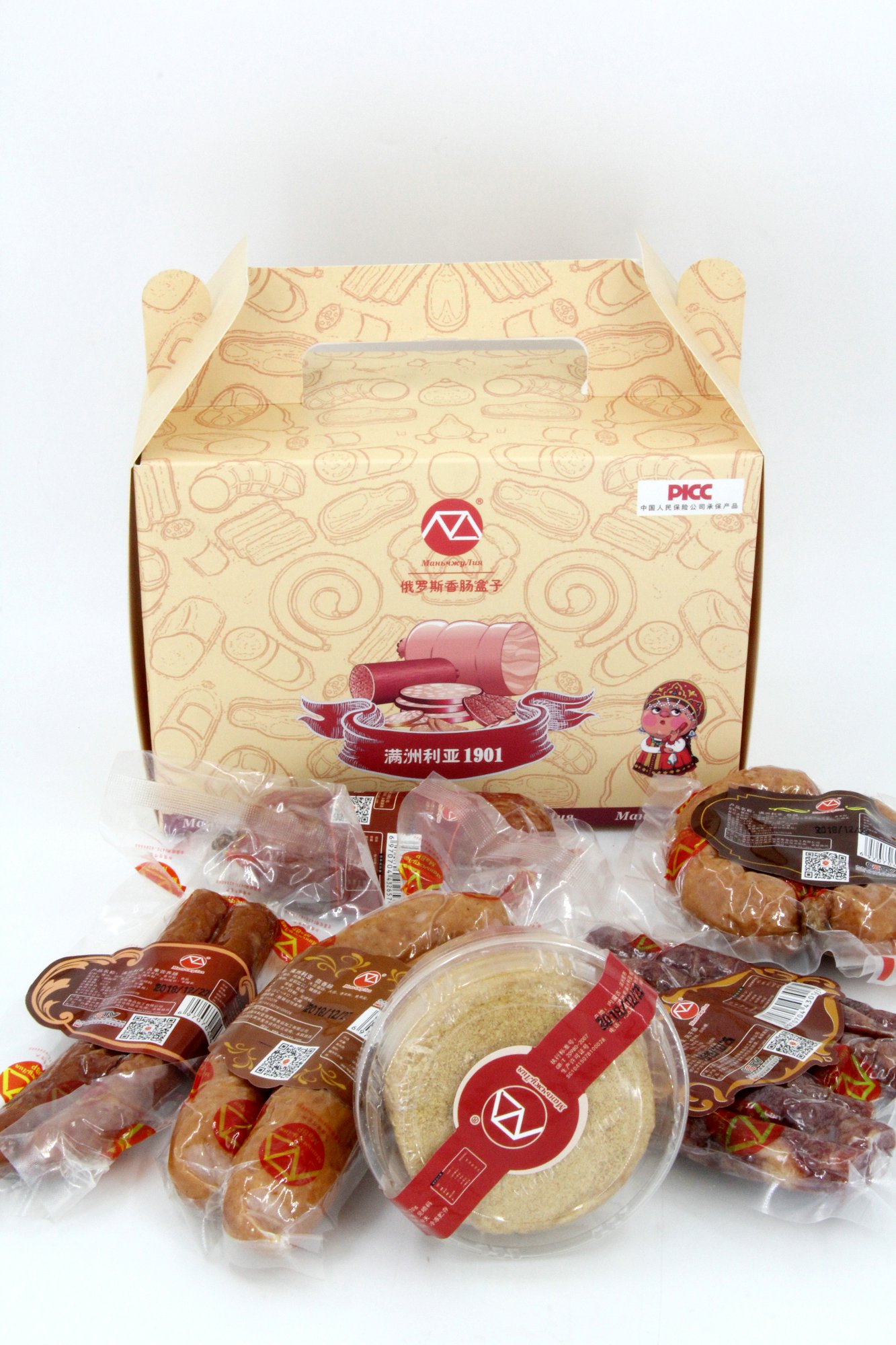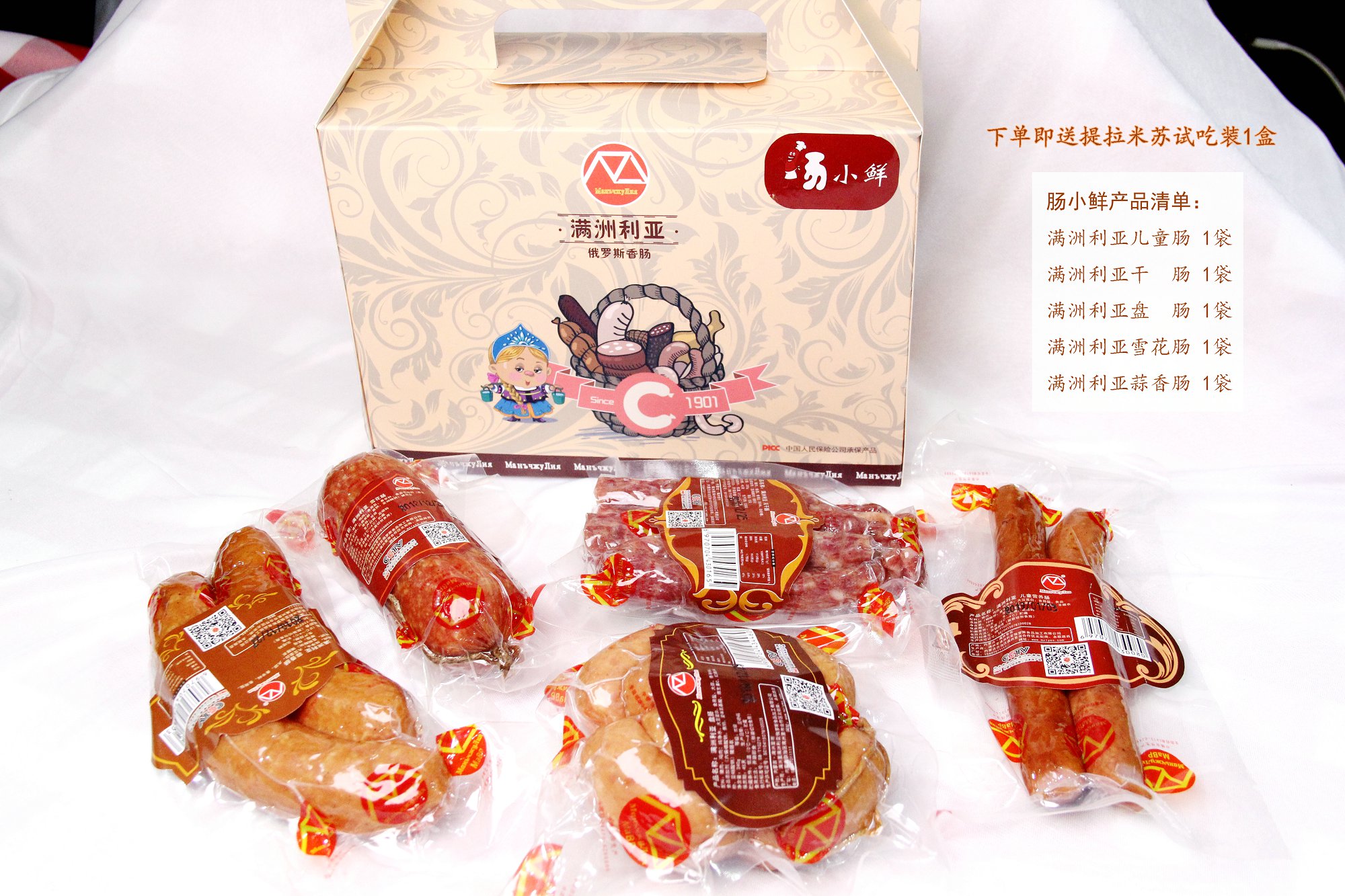 滿洲利亞風(fēng)干腸、盤腸、蒜香腸、兒童腸、雪花腸、迷你提拉米蘇(贈品)各一樣。